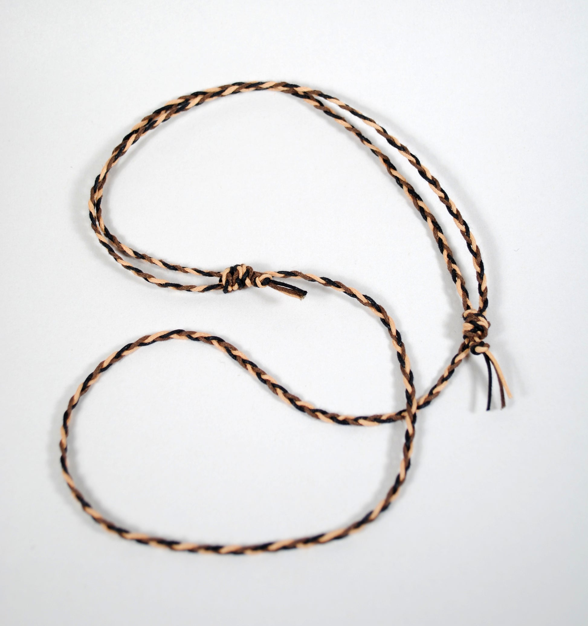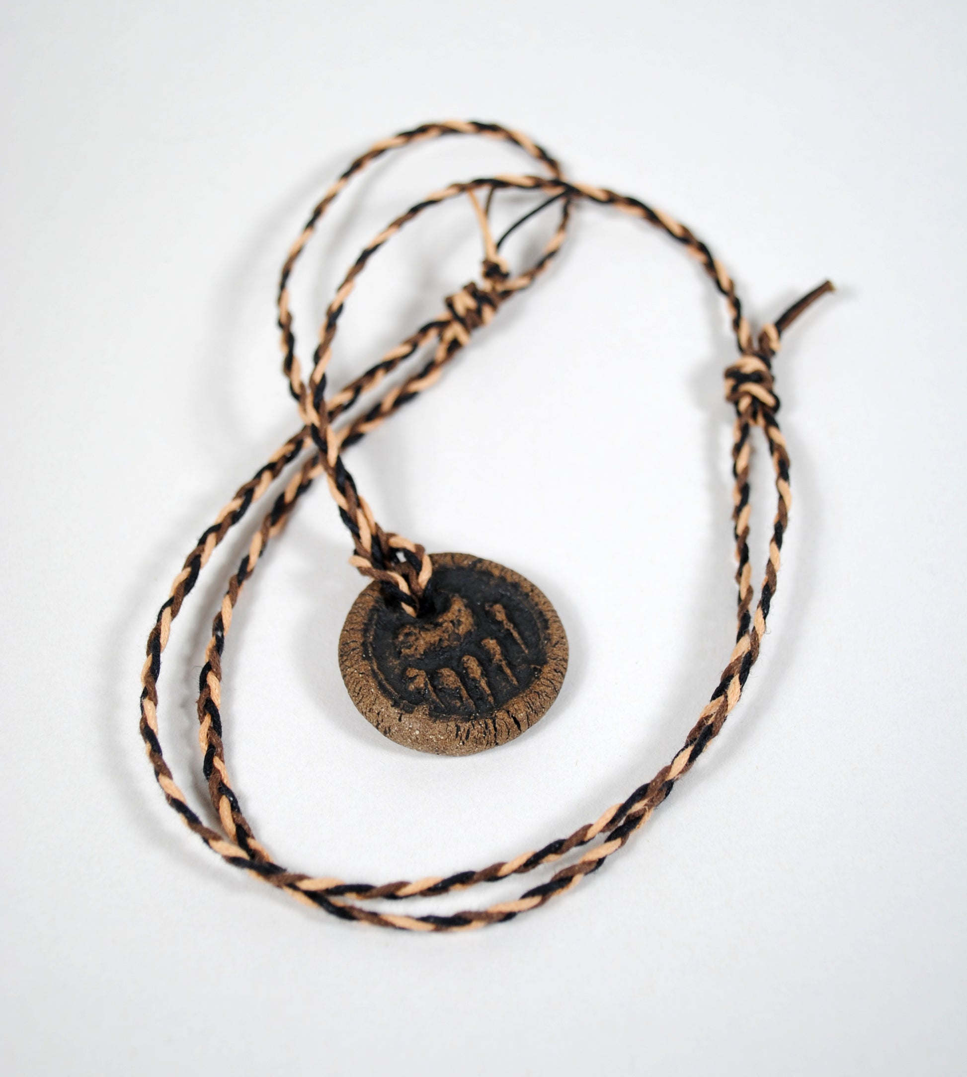 If buying a pendant, this handmade cord is perfectly paired with your new ceramic jewelry! Made of multicolored waxed cotton cord in shades of black, brown and cream, and braided by hand. Knots are adjustable and slide necklace from approximately 18'' to 35'' long.