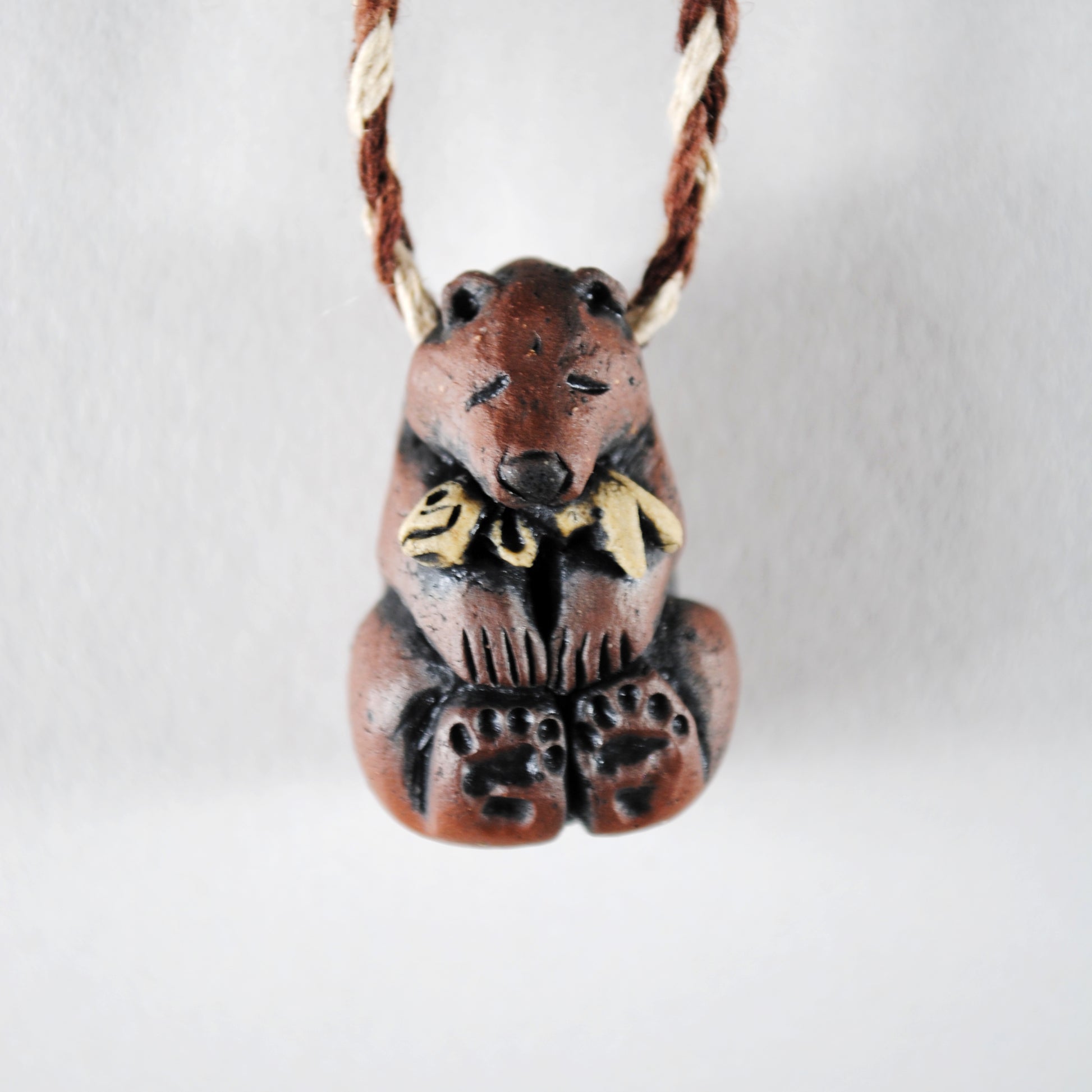 Hand sculpted and one of a kind, this bear pendant is perfect for any ursid lover. Sculpted from red earthenware and white stoneware clay, then fired to cone 6 after a black underglaze wash.